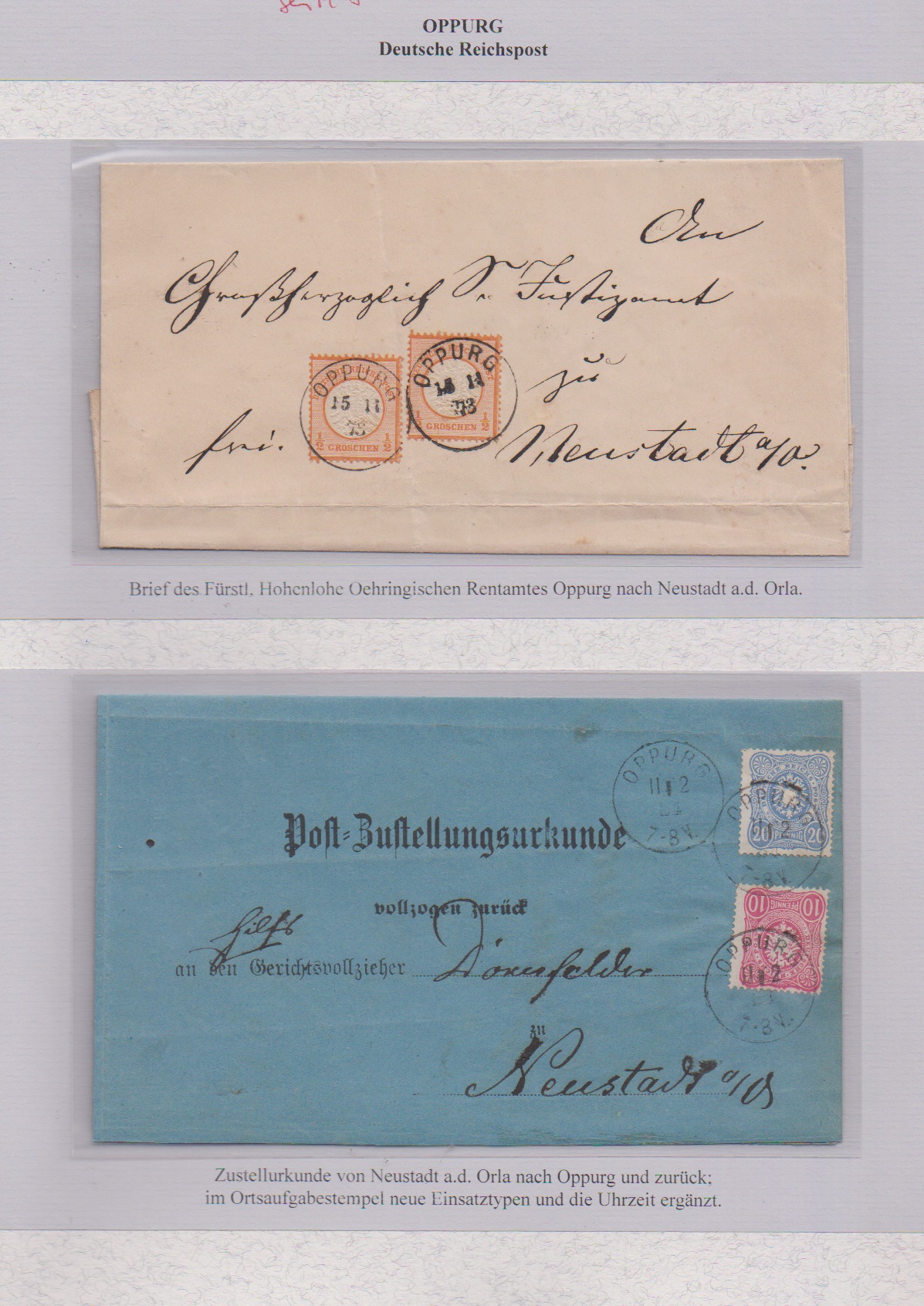 "Oppurg", nachverw. K1 auf gef. Brief mit zweimal 1/2 Gr. Brustschild, sowie neuer K1 auf Postzustellurkunde 1884 mit 10 u. 20 Pfg.