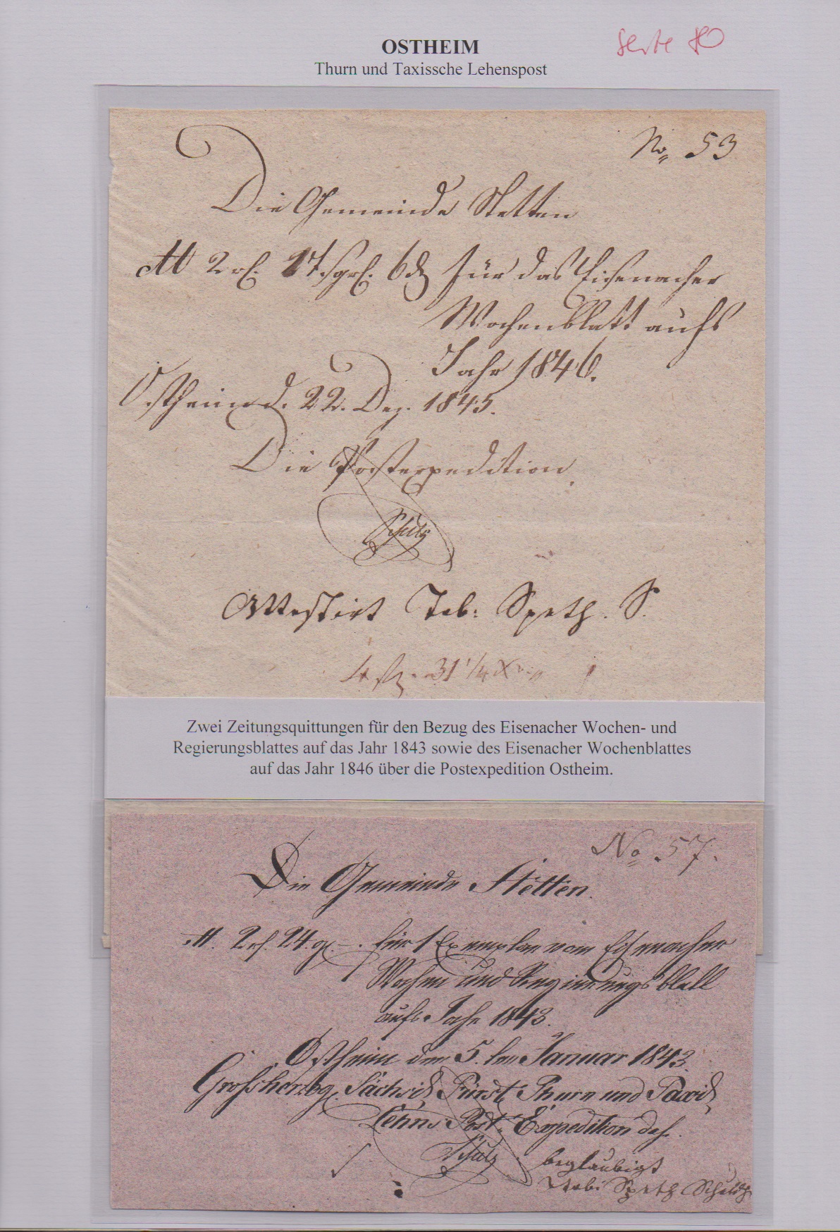 "Ostheim", 1843/46, zwei handschriftliche Zeitungsquittungen ("Die Postexpedition", "Lehens-Post-Expedition")