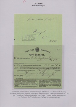 "Ostheim i. Sachs. Weim. Eisen.", Ra3 vom 16.7.75 klar auf grünem "Post-Mandat" von Essen dorthin