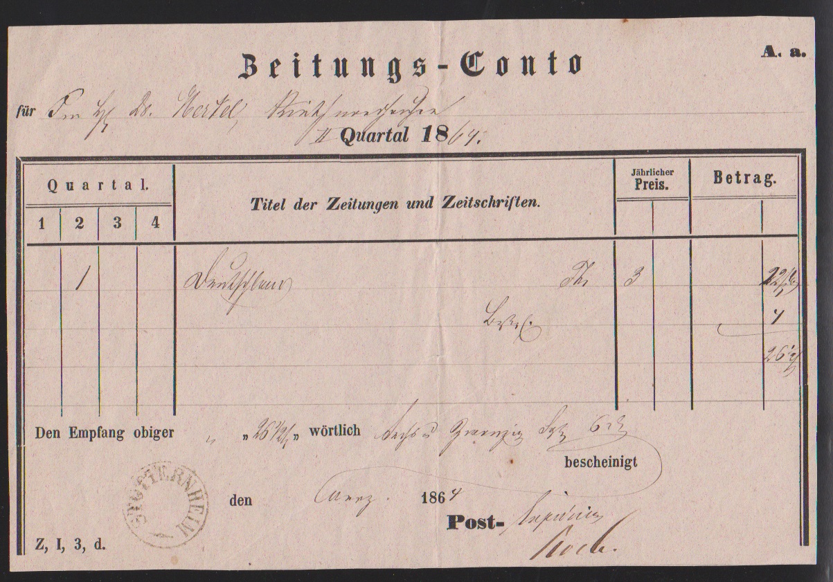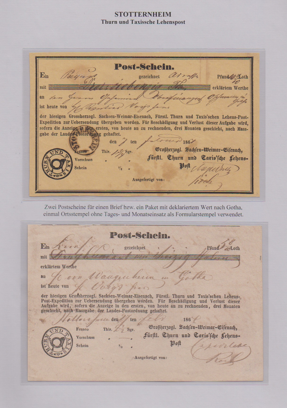 "Stotternheim", aptierter K1 auf Zeitungsschein 1864 und Postschein 1867, ferner weiterer Postschein 1864