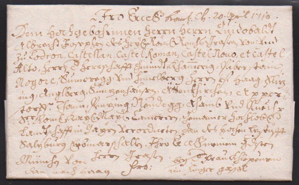 "Wasserburg", 1710-1721, fünf dekorative Schnörkel-Altbriefe, je mit Inhalt und vielzeiliger Ergebenheitsadresse, alle an den Grafen von Lodron in München