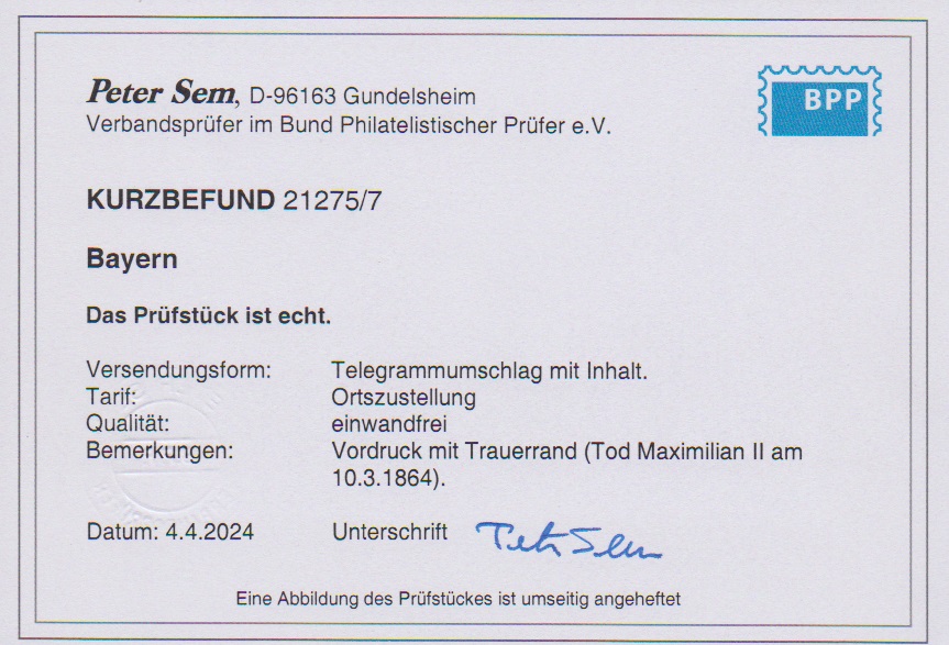 "Passau", 1864 (8.6.), komplettes Telegramm, schwarz gerandetes Trauer-Telegrammcouvert mit entsprechendem Inhalt, diese Formularvariante war nur kurz anläßlich des Todes von Maximilian II. (10.3.1864) in Gebrauch. Fotoexp. Sem