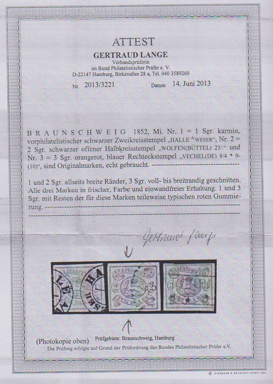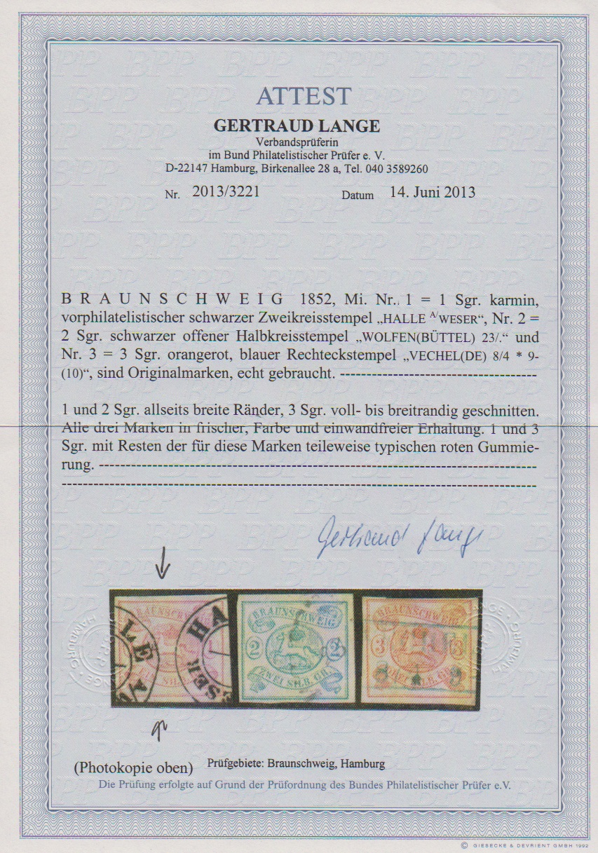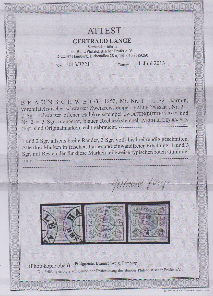 3 Sgr. orangerot, voll- bis breitrandiges Prachtstück mit besserem Ra2 "Vechelde", Attestkopie Lange (für kpl. Satz Nr. 1-3). Mi. 400,-