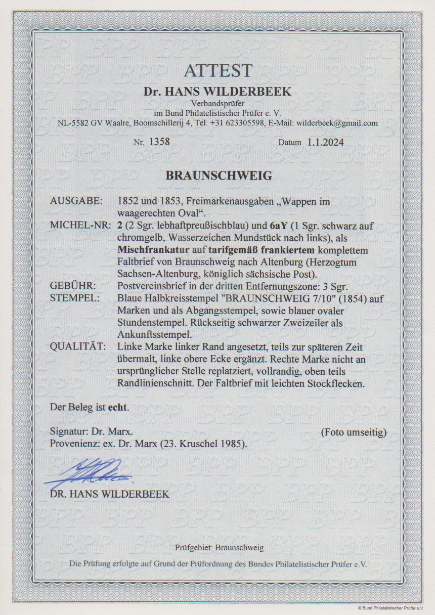 2 Sgr. blau in Mischfrankatur mit 1 Sgr. schw./sämisch (Randreparatur, Klebespuren, Marken waren gelöst) auf Brief mit Bogenstempel "Braunschweig" nach Altenburg, seltene Frankatur, Attest Dr. Wilderbeek (ex Slg. Dr. Marx)