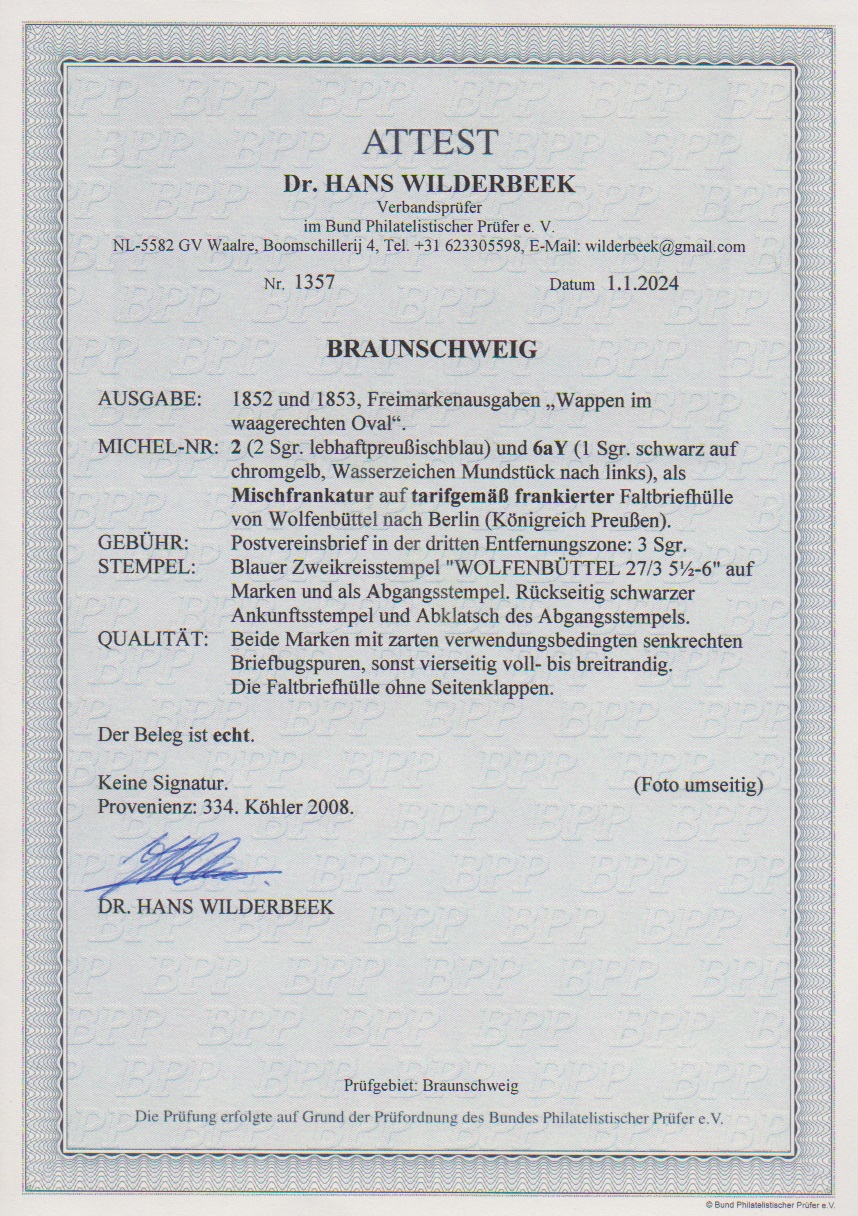 2 Sgr. blau und 1 Sgr. schw./sämisch, Wasserzeichen "Mundstück nach links", je breitrandig, mit K2 "Wolfenbüttel" auf Brief (ohne Seitenklappen, kl. Bugspuren) nach Berlin, eine seltene Mischfrankatur, Attest Dr. Wilderbeek