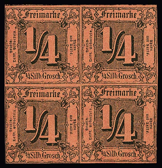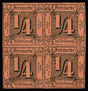 1/4 Sgr. schw./rotbraun, ungebrauchter, allseits voll- bis breitrandiger Viererblock mit Originalgummi, rechtes Paar leichter senkrechter Gummiknitter bzw. eine natürliche Papierpore. Seltene Einheit der 1. Ausgabe mit deutlicher Klischeeverschiebung, Fotoexp. Sem. Mi. 1300,-