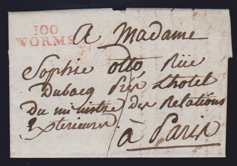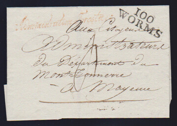 "Worms", 1803, "100 WORMS", schwarzer (mit rotem Franchise-L1) und roter L2 auf zwei Kabinettbriefen (eine Hülle) nach Mainz bzw. Paris