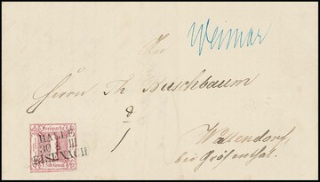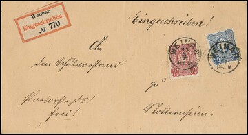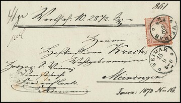 "Weimar",1877, kleiner K1 in sehr seltener, nur kurz verwendeter Type (21mm) auf Recobrief vom 25.8.77 mit 10 u. 20 Pfge. (sowie auf loser 50 Pfge. v. 4.8.77), die Stempeldaten legen eine kurze Aushilfsverwendung im August 1877 nahe, auf Brief n.A.d.E. einzig bekanntes Stück (dazu Ganzsache mit neuem K1)
