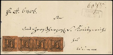 1/4 Sgr. schw./rotbraun per vier, einmal breitrandig, sonst meist vollrandiger Taxisschnitt, auf Brief der 2. Gewichtsstufe von Apolda nach Weimar, sign. Haferkamp