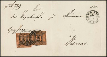 1/4 Sgr. schw./rotbraun per zwei, eine sehr breitrandig, eine nur winzig berührt, auf Brief mit NS "224" und K2 "Berka a. Ilm" nach Weimar. 1/4 Sgr. reduzierte Nahbereichstaxe plus vorfrankiertes Bestellgeld, sign. Sommer