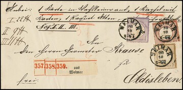 "Weimar", nachverw. kleiner K1 klar auf dekorativem Brustschild-Paketbegleitbrief mit 1/4 Gr. violett (leichte Bugspur), 2 1/2 Gr. rotbraun und 5 Gr. ockerbraun, Attest Krug