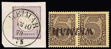 "Weimar", alter aptierter L1 (ehemals L2) noch zur Inflazeit wiederverwendet auf Paar 5 Pfge. Dienst, ferner neuer K1 auf Briefstück 1/4 Gr. gr. Brustschild, sowie kleiner K1 auf Briefstück 2 Gr. kl. Schild, dazu weitere Nachverwendungen auf Preußen
