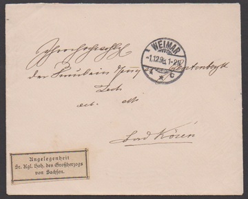 "Weimar", 1898, Steg-K2 auf portofreiem Couvert des Großherzogs mit entsprechender schwarzer Vignette "Angelegenheit Sr. kgl. Hoh. des Großherzogs von Sachsen"