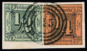 1/4 Sgr. schw./rotbraun, überrandiges Luxusstück, nebst 1/2 Sgr. schw./grün, auf Briefstück mit NS "225"