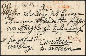 "Worms", 1809, "100 WORMS" und "F.P.M.", roter L2 bzw. Transit-L1 auf Kabinett-Adelsbrief "p. Franckfurt et Marburg" nach Canstein bei Arolsen, sehr seltener Transitstempel