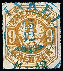 "Winkel", zentrischer nachverw. blauer K2 (mit Block) auf Preußen 9 Kr., etwas hell