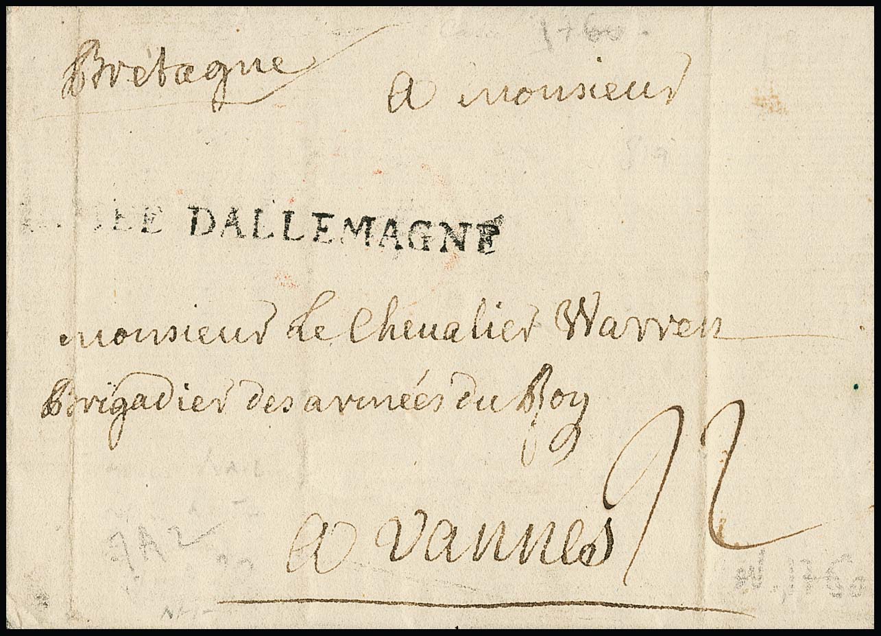 "Cassel", 1760, 25.2., seltener gef. französischer Armeepostbrief aus dem 7-jährigen Krieg mit L1 "ARMÉE D`ALLEMAGNE" nach Vannes/Bretagne