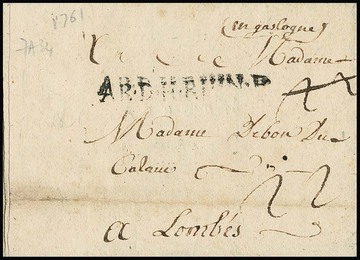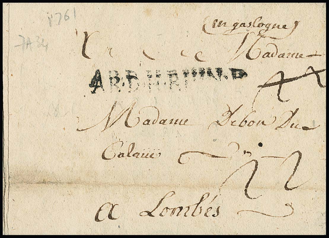 "Cassel", 1761, 1.9., seltener französischer Feldpostbrief (unten Falte) mit kpl. Inhalt ("au camp ...") und L1 "AR. D. H. RHIN" nach Lombes/Gascogne