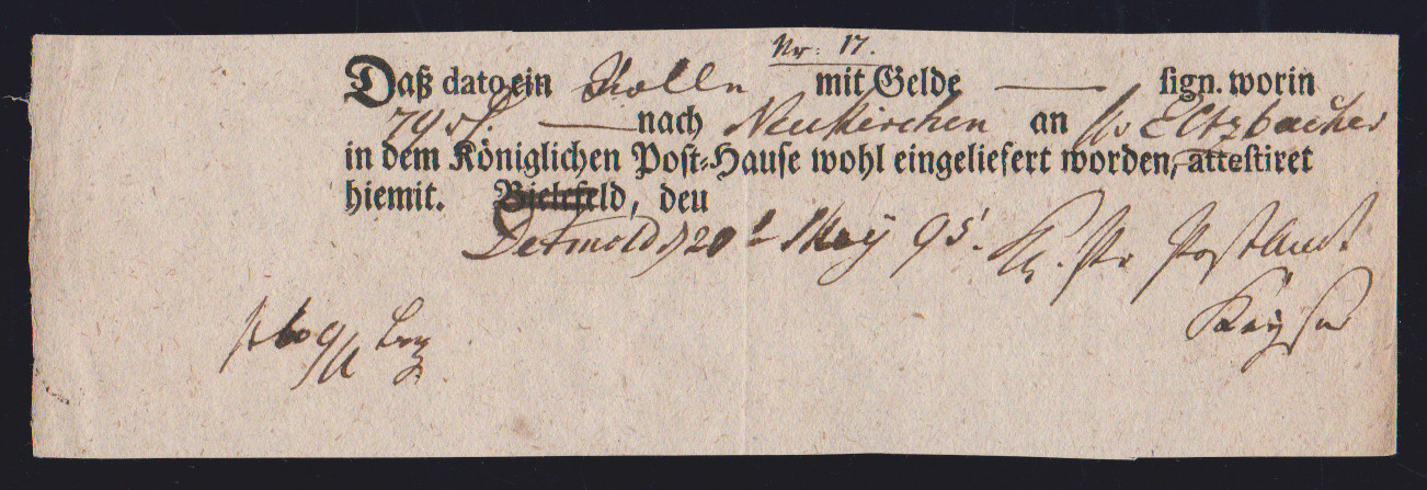 "Detmold", 1795, Postschein-Provisorium, Ortsdruck "Bielefeld" handschriftlich geändert, "K. Pr. Postamt"