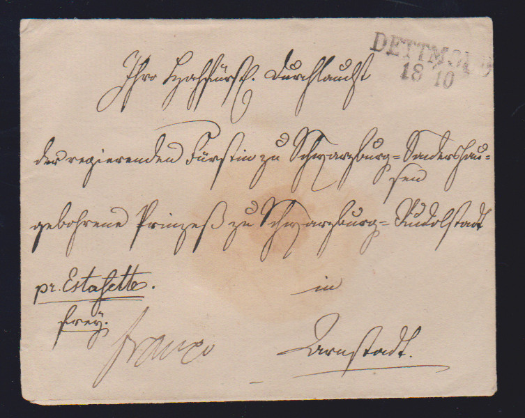 "Detmold", 1830, hs. auf kleinem Postschein "Postbüreau", sowie L2 1827 auf Brief "pr. Estafette" nach Darmstadt an die Fürstin zu Schwarzenburg-Sondershausen