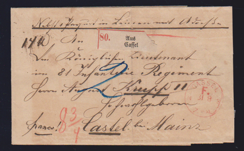 "Cassel F.", (1870), roter Franco-K1 auf gef. Paketbegleitbrief an den Leutnant August Krupp II. in der Bundesfestung Mainz