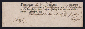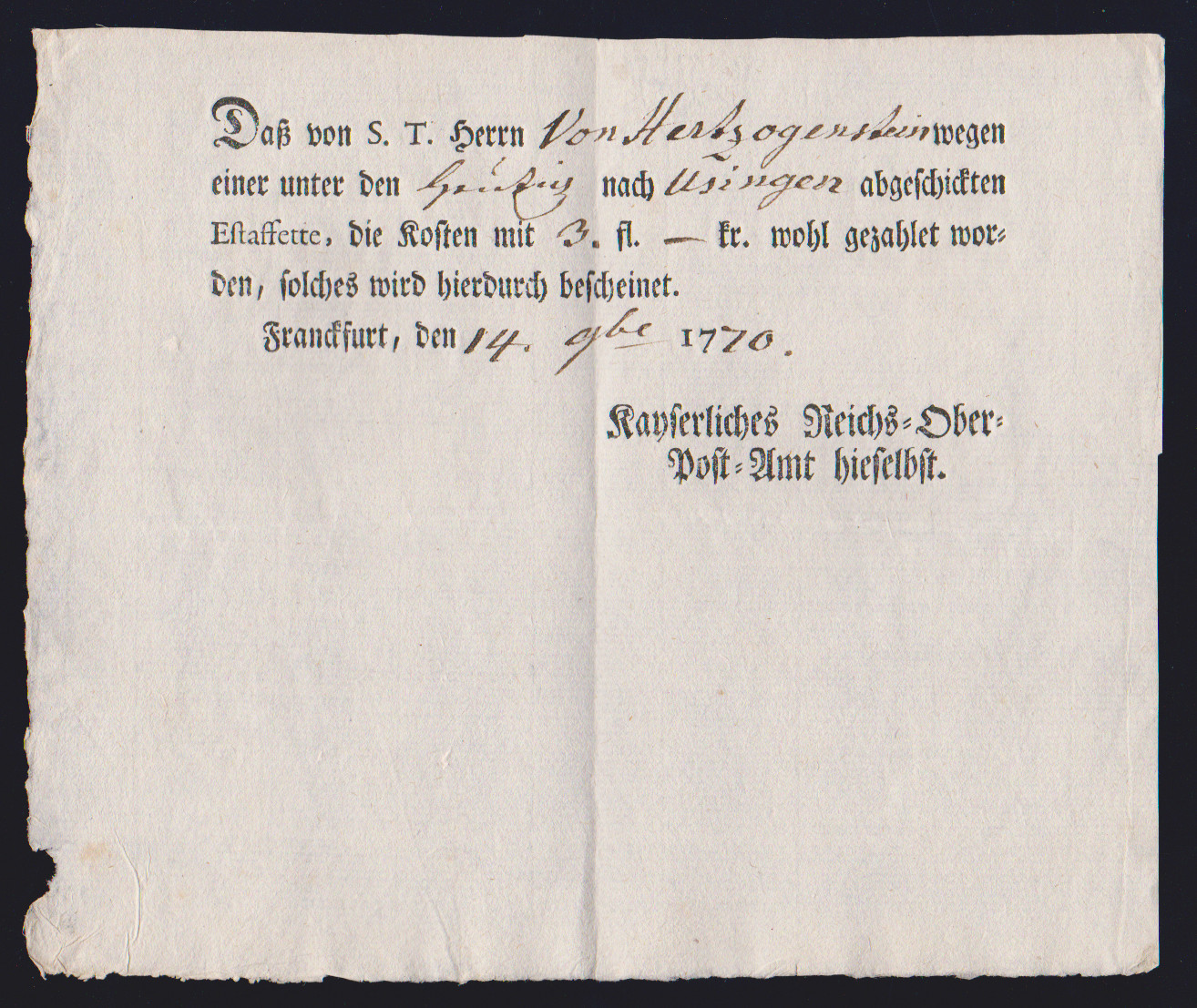 "Frankfurt", 1770, "Kaiserliches Reichs-Ober-Post-Amt hieselbst", dekorative Estaffetten-Gebühren-Quittung für einen Brief