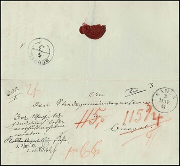 "Bürgel", 1851, bisher noch nicht registrierter K2 klar rs. als Ankunftsstempel auf Postvorschußbrief mit Aufgabe-K1 "Kahla" dorthin