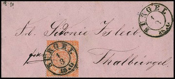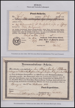 "Bürgel", 1847, Zier-K1 auf Paketbrief, ferner K2 auf Retourbrief 1858, sowie zwei Postscheine 1854/63