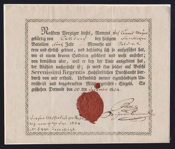 "Detmold", 1834, dekor. gesiegelter Militär-Entlassungsschein