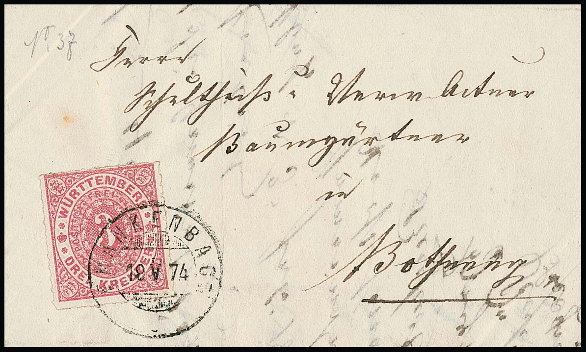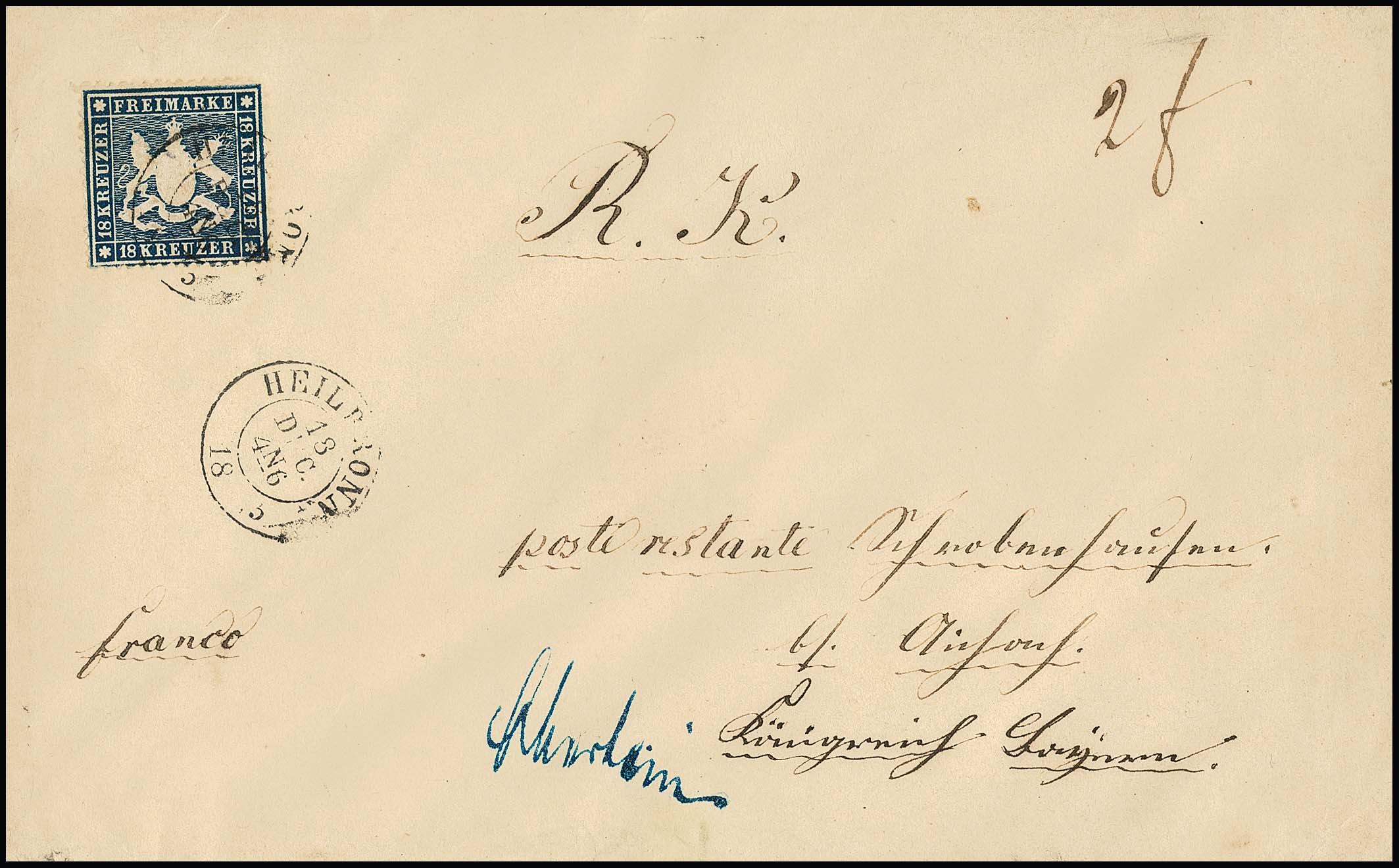 18 Kr. blau, ausgabetypisch etwas unregelmäßig gezähnt, als gute Einzelfrankatur auf Couvert der 2. Gewichtsstufe von Heilbronn nach Aichach, Mi. 7500,-