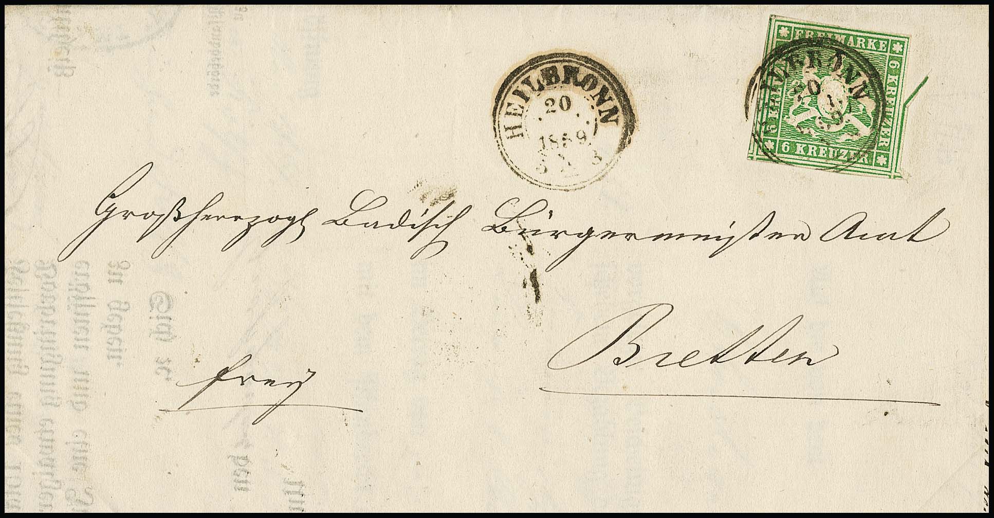 6 Kr. dunkelgrün, enorm riesenrandig geschnittenes Luxusstück, dreiseitig größere Teile der Nebenmarken, auf Brief aus Heilbronn