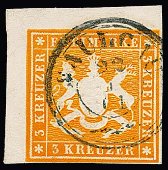 3 Kr. schw./gelb, Kabinettstück mit seltener Entwertung durch stummen Stempel von Tuttlingen ("enges Quadrat", Mi.-Nr. 9, + 1400,-), Attest Thoma