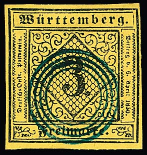 3 Kr. schw./gelb, Kabinettstück mit zentrischem stummen blauen Vierringstempel von Tübingen, Attest Thoma