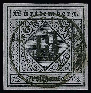 18 Kr. schw./graublau, breitrandiges Luxusstück mit zentrischem K2 "Göppingen", Attest Irtenkauf "ein schönes Exemplar". Mi. 900,-