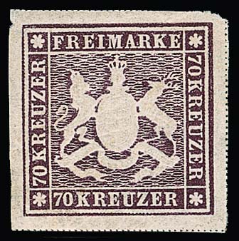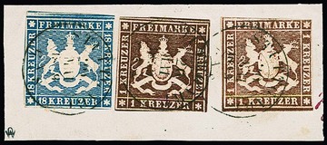 1 Kr. braun und 1 Kr. tiefdunkelbraun, nebst 18 Kr. blau, ausgabetypisch geschnittene, mit den beiden verschiedenen Nuancen sehr ungewöhnliche Kombination, auf Briefstück (möglicherweise von einem Rußland-Brief) mit K2 "Stuttgart", sign. Ebel und Attest Irtenkauf. Mi. lose schon 2600,-