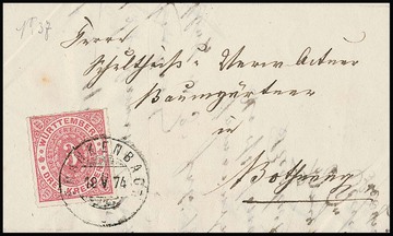 5 Pfg. dunkelgrün, Abart "geschnitten", im waagerechten Paar, nebst Paar 10 Pfg. rot, auf Einschreibebrief von Ehingen 1902 nach München, der Einschreibe-Zettel noch beiliegend. Im Gegensatz zu den philatelistisch beeinflußten bzw. "gemachten" Briefen von geschnittenen Marken der späteren Ausgaben ist das vorliegende Stück das einzige Belegstück für eine Verwendung dieser geschnittenen Marke und ein Unikat (im Michel nur ungebraucht/postfrisch bewertet), Unikat und "eine große Württemberg-Seltenheit", wie auch das Attest Thoma bestätigt ("einwandfrei")