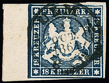 18 Kr. dunkelblau, rechts unten min. berührt, links 7mm breiter Bogenrand (sehr selten), klarer K2 "Ulm", Atteste Thoma und Miro