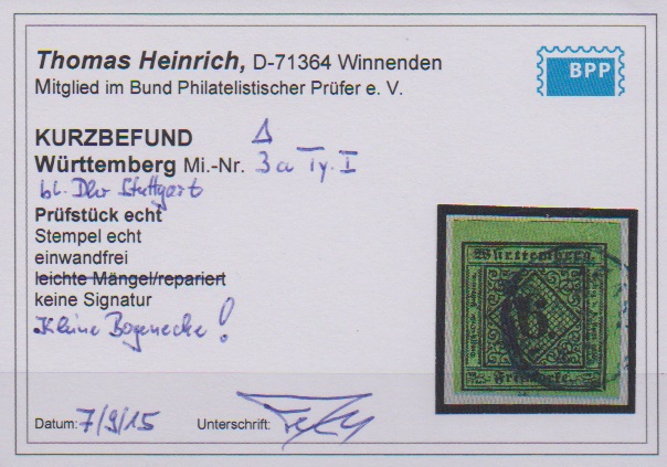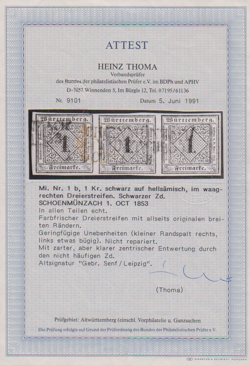 1 Kr. schw./hellsämisch, dekor. Dreierstreifen mit L2 "Schoenmünzach", rechte Marke kleiner Randspalt und links leicht bügig, sonst frisch und gut, sign. Senf und Attest Thoma. Mi. 1500,-