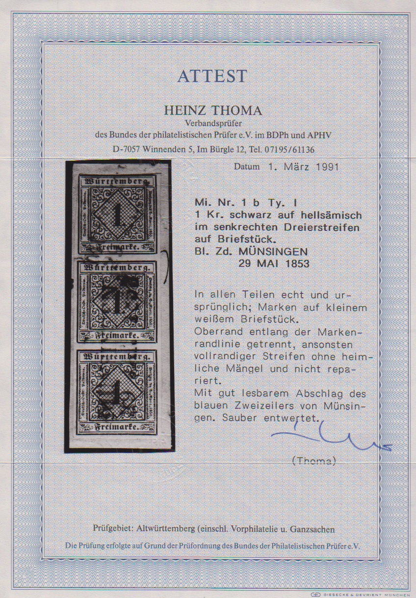 1 Kr. schw./hellsämisch, senkrechter Dreierstreifen auf Briefstück mit blauem L2 "Münsingen", obere Marke geringfügig berührt, sign. Kruschel und Attest Thoma. Mi. 1500,-
