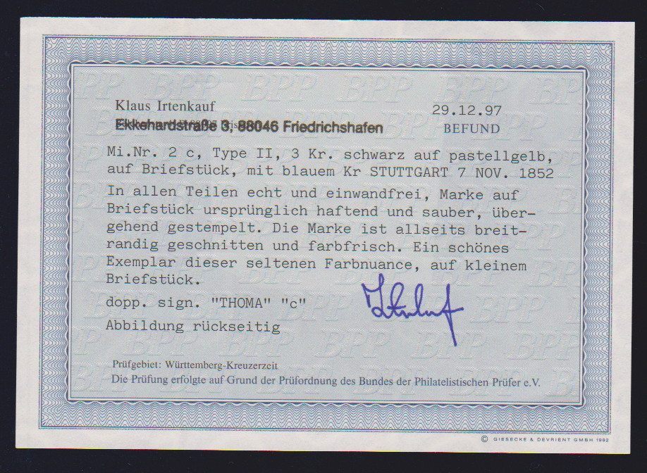 3 Kr. schw./gelb auf Luxusbriefstück mit blauem L2 "Langenburg", sign. Thoma