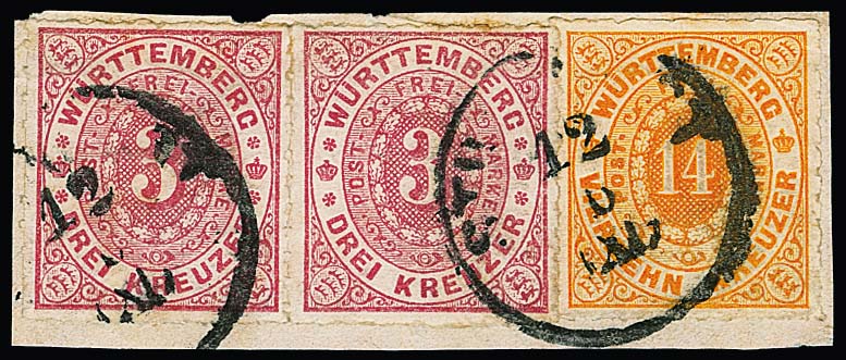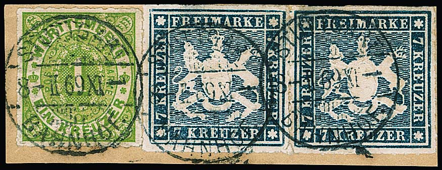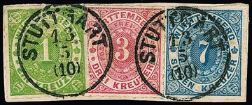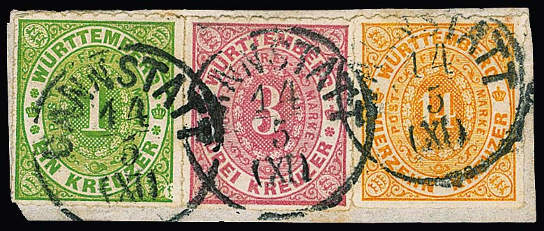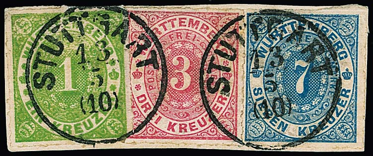 1 Kr. grün, 3 Kr. rosa und 7 Kr. blau auf Kabinettbriefstück mit K1 "Stuttgart", sign. Heinrich