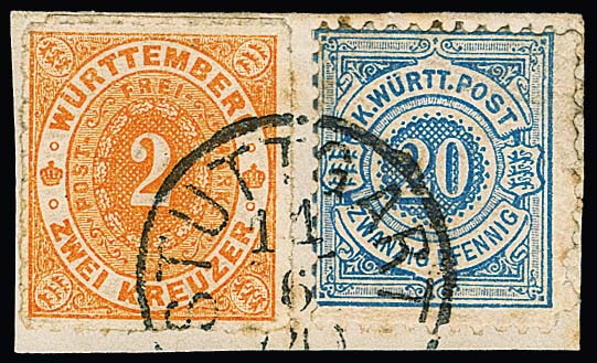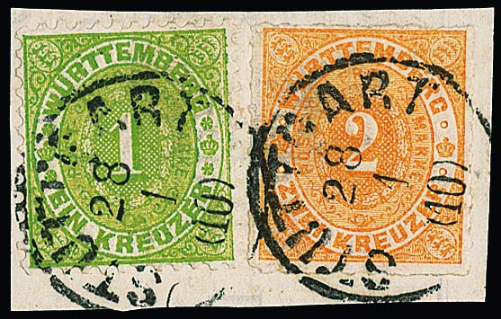 7 Kr. schieferblau im tadellosen Paar in Mischfrankatur mit 1 Kr. grün, "Eirund" (oben min. unruhig durchstochen), auf dekorativem Briefstück mit DB "Stuttgart Bahnhof", sign. Thoma