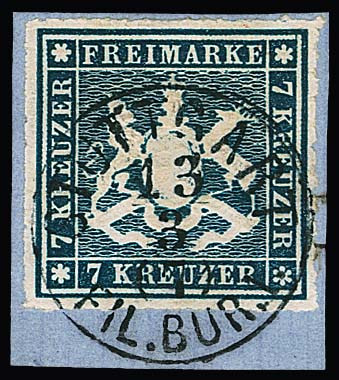 7 Kr. blau, Kabinettstück, und schieferblau, Luxusbriefstück mit K1 "Stuttgart Fil. Bur.", je sign. Heinrich. Mi. 420,-