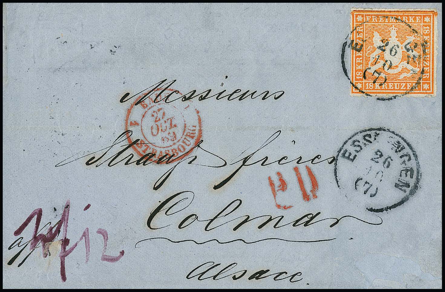18 Kr. orange einzeln mit K1 "Esslingen" auf Brief der 2. Gewichtsstufe 1869 nach Colmar. Marke ganz winziger Randspalt, m.E. belanglos, Brief unten kleiner verklebter Papierfehler, sign. Grobe und Attest Heinrich. Mi. 7000,-