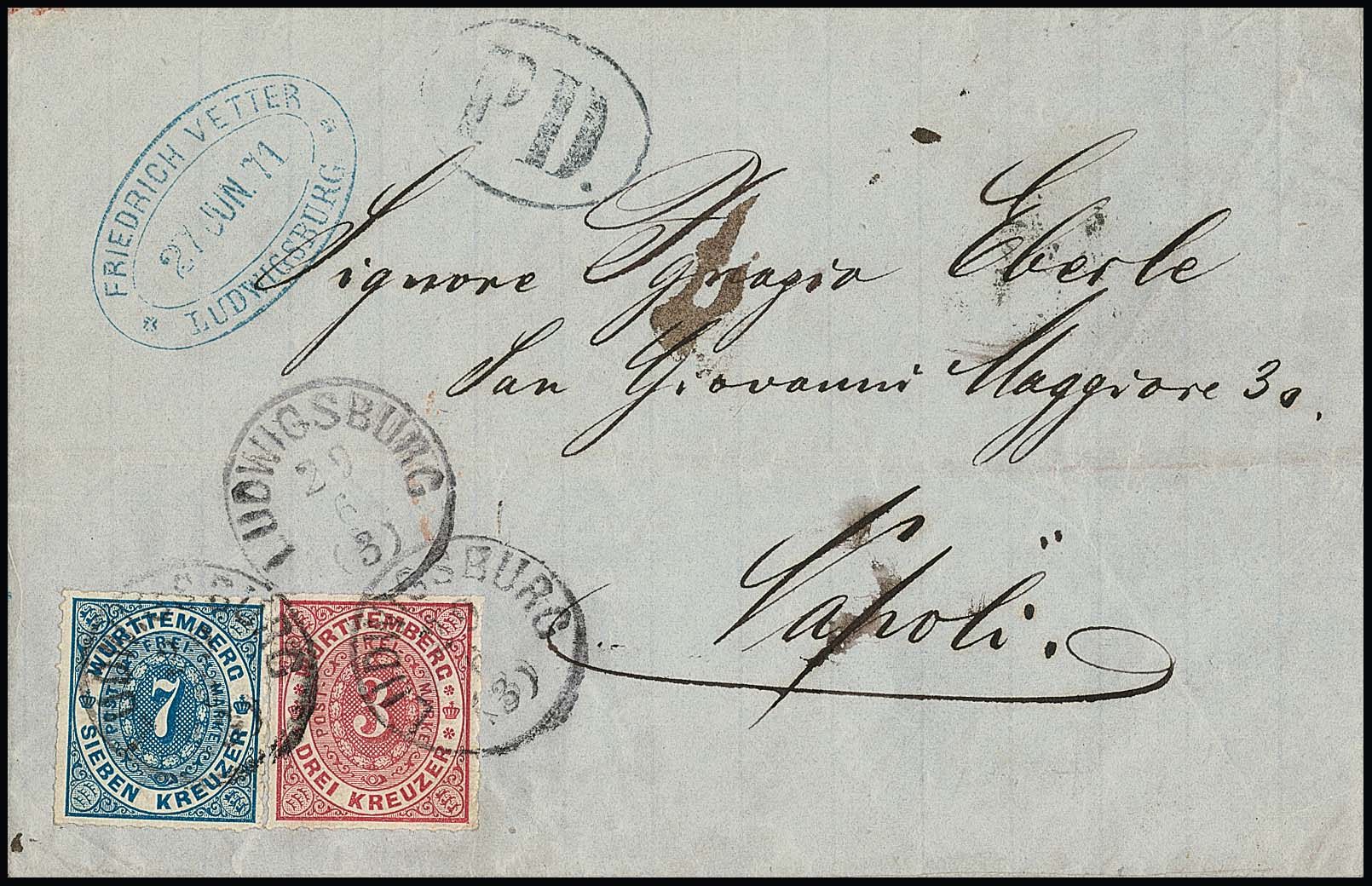 3 Kr. rosa und 7 Kr. blau auf Prachtbrief mit K1 "Ludwigsburg" 1871 nach Neapel