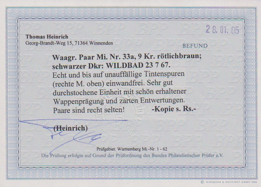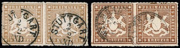 9 Kr. rötlichbraun, waagerechtes Prachtpaar mit K2 "Wildbad" (und linke Marke oben kleine Tintenspur), sowie fahlbraun (min. Durchstich-Unebenheiten) ebenfalls im Paar, sign. bzw. Fotoexp. Heinrich. Mi. 1200,-