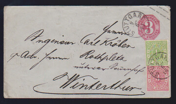 1 Kr. grün und 3 Kr. rosa, Kabinettstücke mit K1 "Stuttgart" auf Ganzsache 3 Kr. rosa 1871 nach Winterthur/Schweiz