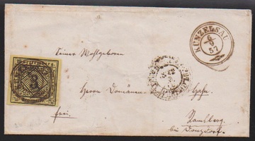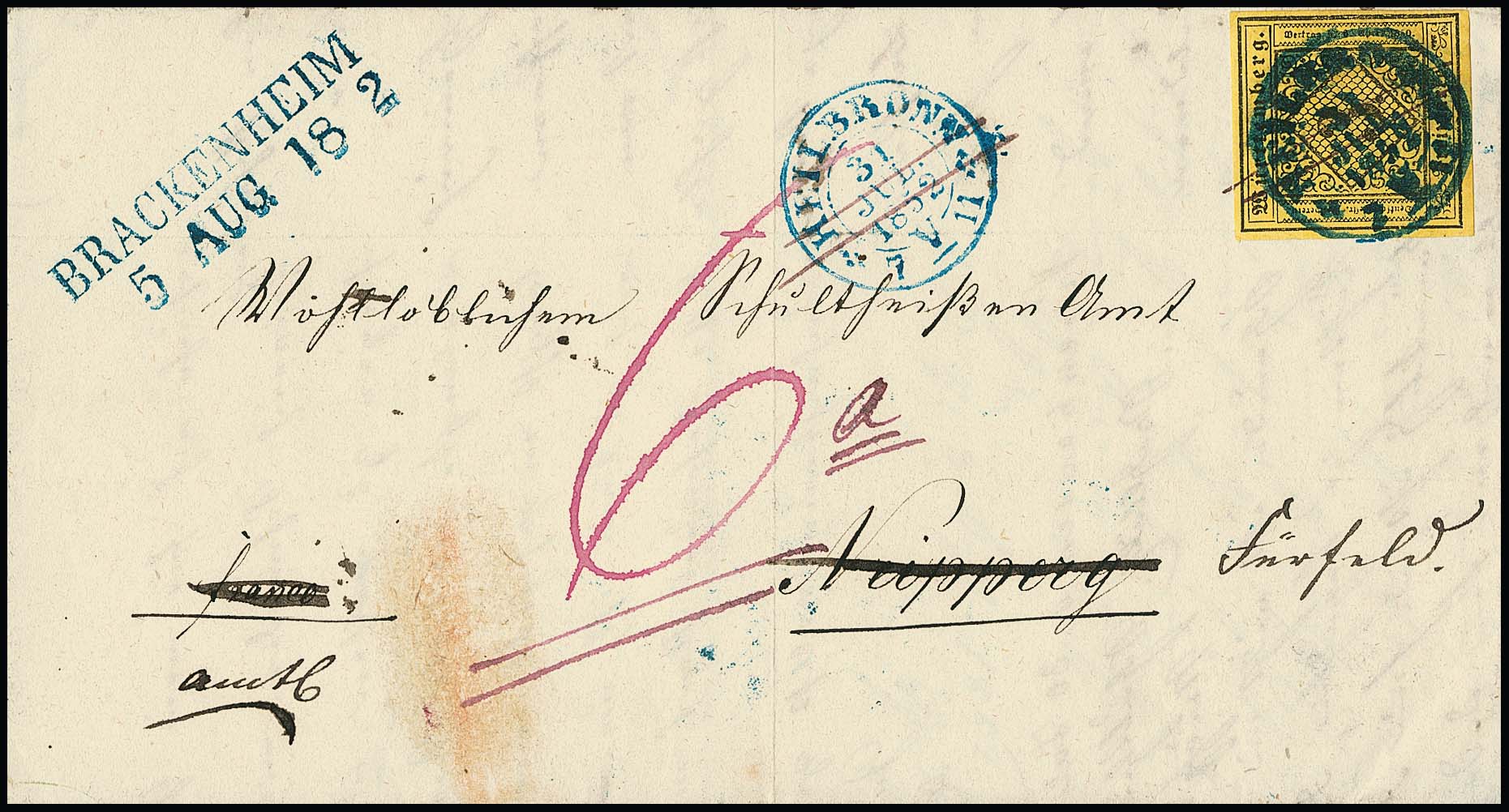 3 Kr. schw./dunkelgelb, gut gerandet, mit K2 "Heilbronn" und Federzügen auf doppelt verwendetem Brief nach Neipperg, erneut mit L2 "Brackenheim" und Bartaxe "6" nach Fürfeld gelaufen