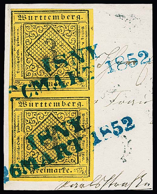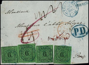 6 Kr. schw./gelbgrün per vier (teils Mgl.) auf Nachsendebrief-Vorderseite von Tübingen 1852 nach Paris und weiter. Seltene hohe Mehrfachfrankatur, Fotoexp. Irtenkauf