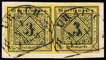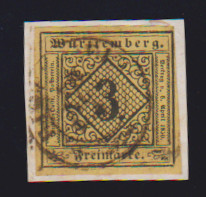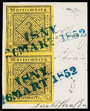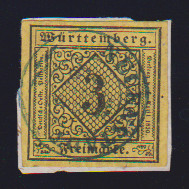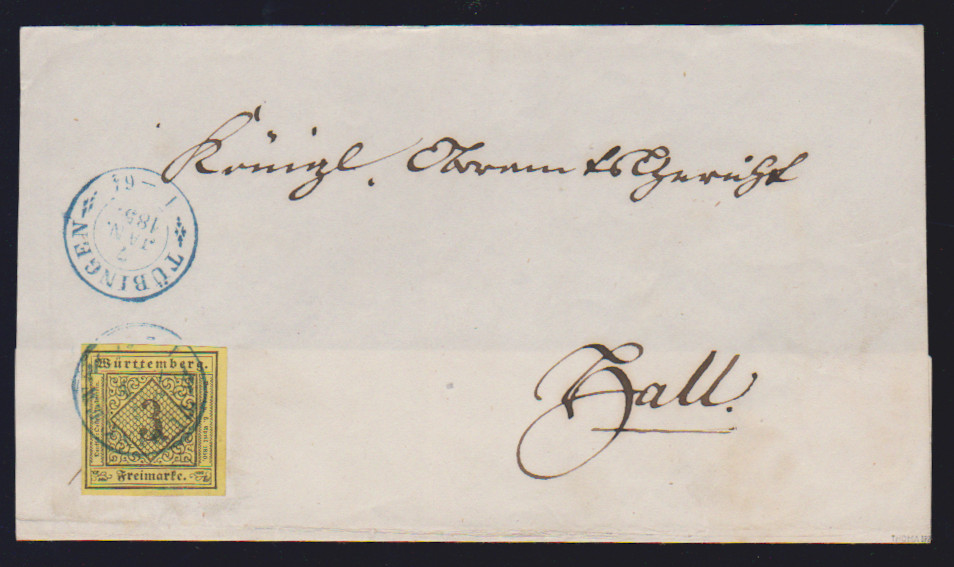 3 Kr. schw./dunkelgelb, seltene Type IVb, Kabinettstück mit blauem K2 "Tübingen" auf rs. unkpl. Brief, sign. Thoma